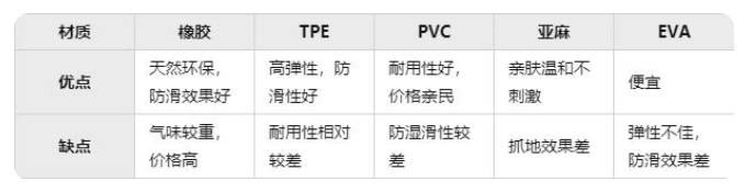 市面上各種材質(zhì),各種花色,從幾十到上千價(jià)格不等的瑜伽墊,但是大概可分為橡膠,TPE,PVC,亞麻,EVA這幾大類(lèi),這幾種材質(zhì)的優(yōu)缺點(diǎn)對(duì)比總結(jié)如下: